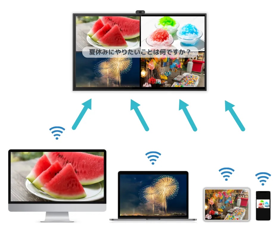 同時に複数台の機器から無線接続で表示が可能なため、複数の生徒や担当者の回答を同時に表示して比べて見る事ができます。