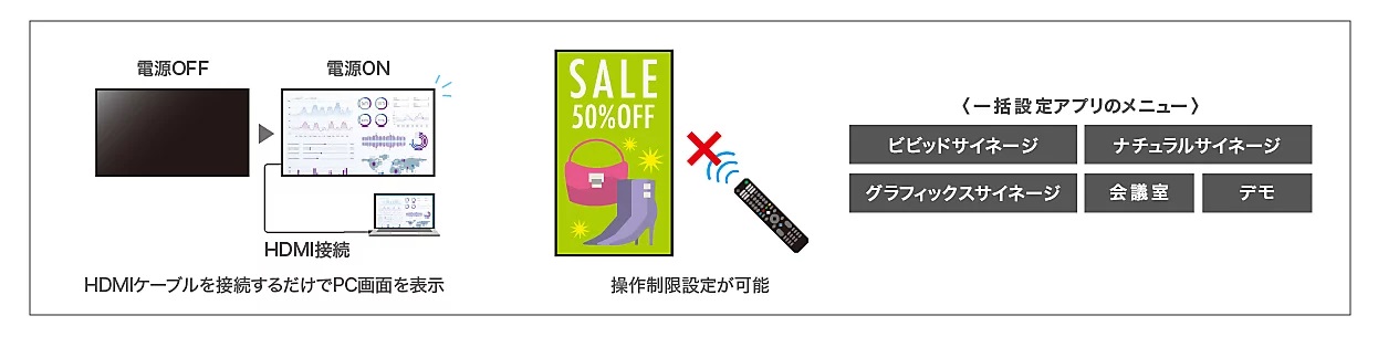 現場それぞれの要望に応えるため、プロモードには数十もの設定項目を用意。リモコンを使って簡単にカスタム設定ができます。会議室用途では、HDMIケーブルでPCと接続するだけでブラビアの電源が入り、PC画面を表示することができたり、ホテル客室テレビやサイネージ用途では音量設定や操作制限ができるなど、細かな制御を可能にします。さらに、利用頻度の高い会議室/サイネージ用途には、一括設定アプリを搭載しています。また、会議用・サイネージ用など、用途別のおすすめ設定やアプリ情報をWebで公開。設定手順もわかりやすく紹介しているので、各用途に合わせたセットアップが簡単に行えます。より細かなカスタマイズを行いたい方に向けて、技術仕様の詳細も公開しています。