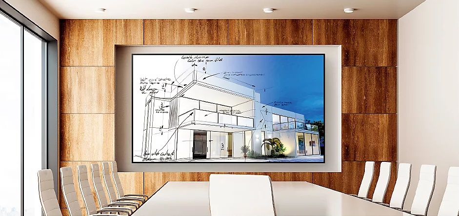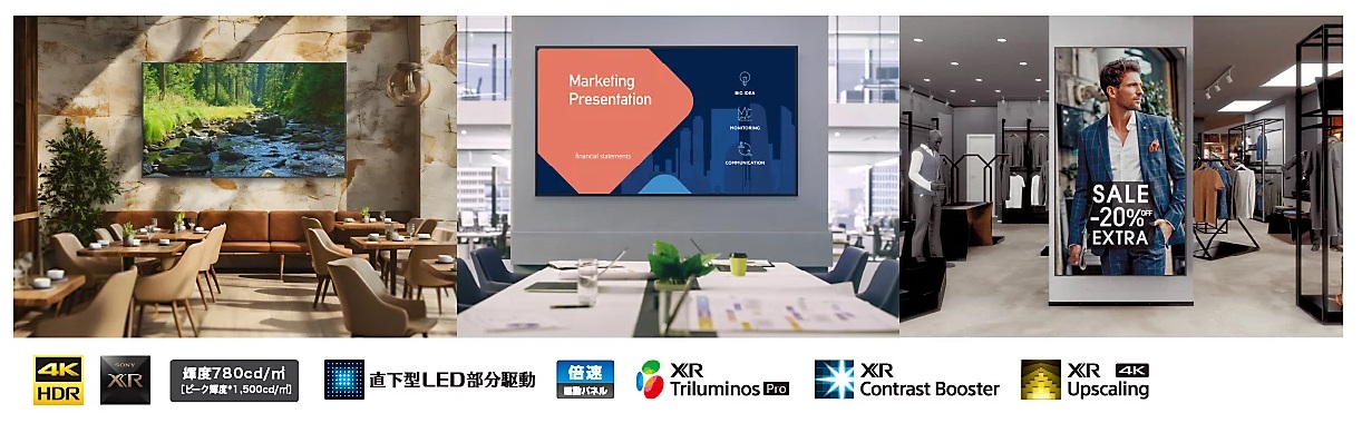 「ディープブラック・ノングレアコーティング」を採用したことで、47%というヘイズ値で映り込みを大幅に抑制しながら、認知特性プロセッサー「XR」とピーク輝度1,500cd/m2(*)の直下型LED部分駆動パネルによる高コントラストな映像表現を実現しました。広大な空間でも際立つ98V型大画面で、大会議場だけでなく受付ロビーやショールームなどの外光や照明の強い場所でも、映り込みを抑えながら精細かつ華やかな映像で空間を彩ります。
